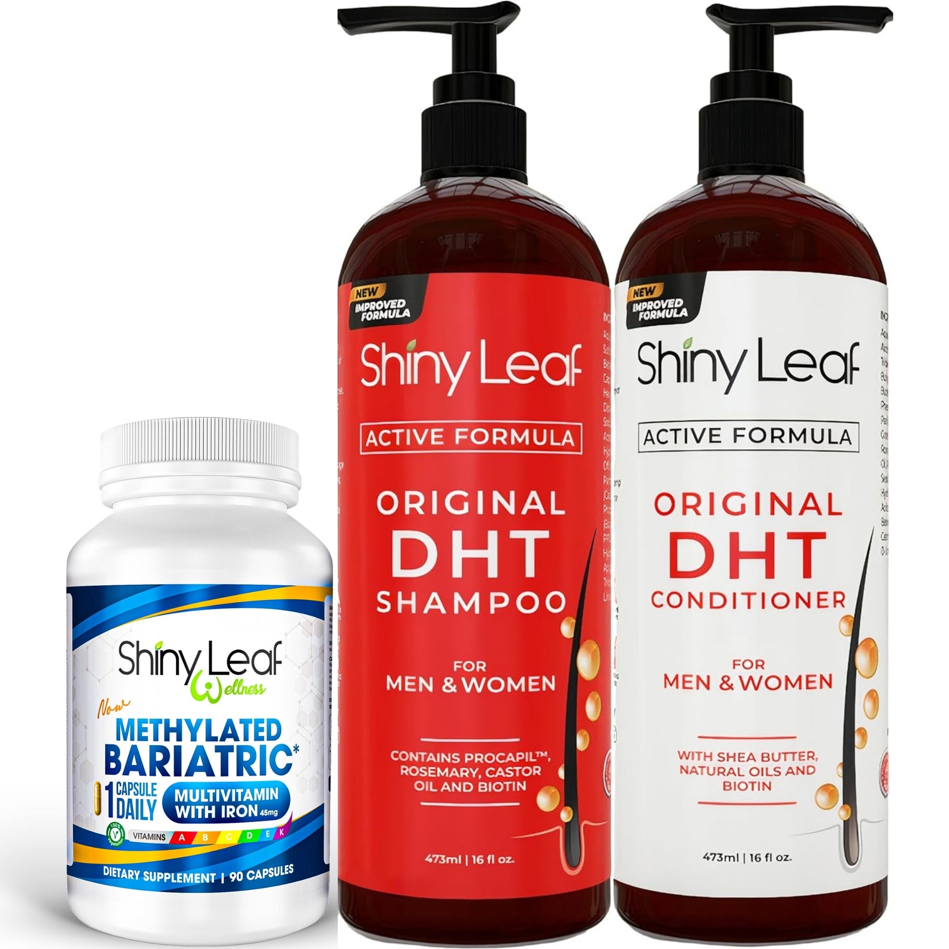 The Shiny Leaf Essential Hair Wellness Bundle pairs the Original DHT Shampoo and Conditioner Set with the Multivitamin with Iron to combat hair loss and promote healthy hair growth. The shampoo and conditioner reduce DHT-related thinning and strengthen hair, while the multivitamin replenishes essential nutrients like iron and biotin. Perfect for post-bariatric surgery patients or anyone experiencing hair loss, this bundle provides a complete solution for thicker, healthier hair and overall wellness.