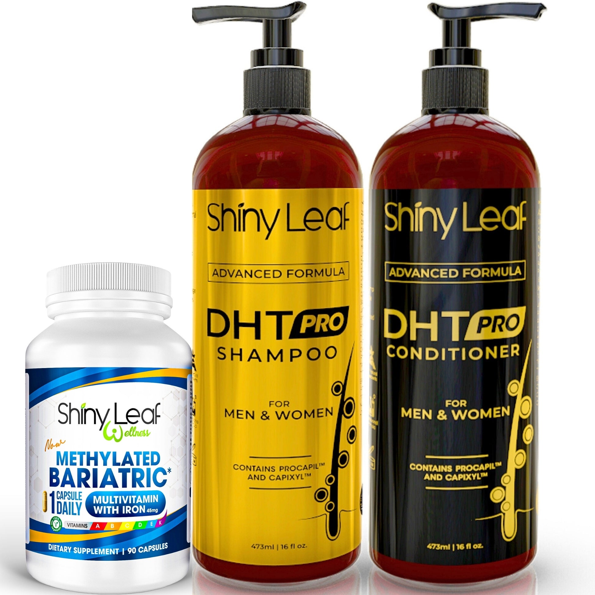 The Shiny Leaf Bariatric Hair Wellness Bundle combines the DHT Pro Shampoo and Conditioner Set with the Multivitamin with Iron to combat hair loss and promote healthy hair growth, especially for post-bariatric surgery patients. The shampoo and conditioner target DHT and strengthen hair, while the multivitamin replenishes essential nutrients like iron and biotin. Together, they provide a complete solution for thicker, healthier hair and improved overall wellness.